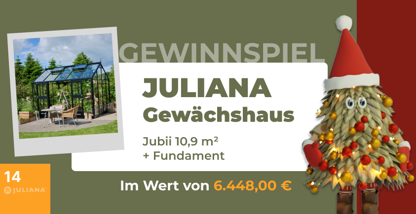 Unsere Aktion im heutigen Türchen: Bei telefonischer Bestellung erhalten Sie die nächsten 14 Tage eine kostenlose Einlagerung bis März 2026 für ihr neues Juliana Gewächshaus und 25% Rabatt auf das Zubehör!