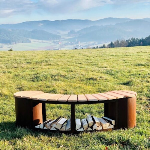 Die Sitzfläche besteht aus hochwertigem Lärchenholz, das für eine besonders ansprechende Optik sorgt. Der offene Bereich unter der Sitzfläche eignet sich ideal zur Aufbewahrung von Brenn- oder Scheitholz. Wie alle Badeko Artikel vollständig "Made in Germany".