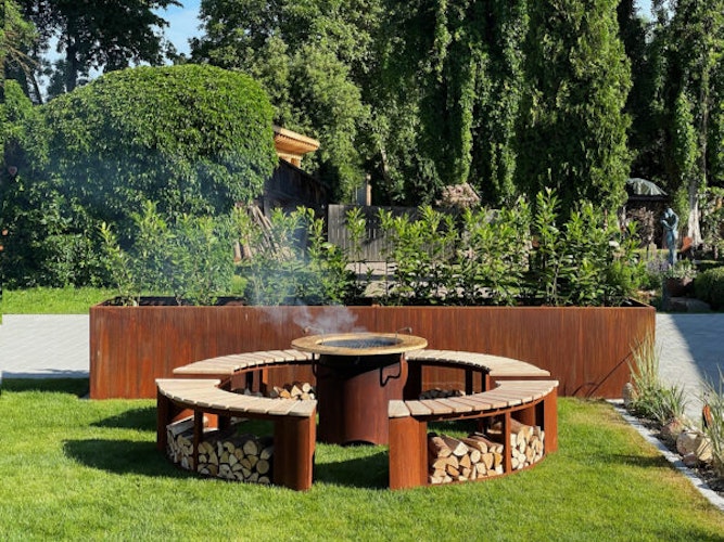 1x Feuerstelle Durchmesser: 100 cm, Höhe: 70 cm, - 4x Bänke: Breite: 170 cm (ohne Lehne) - Aus Edelrost