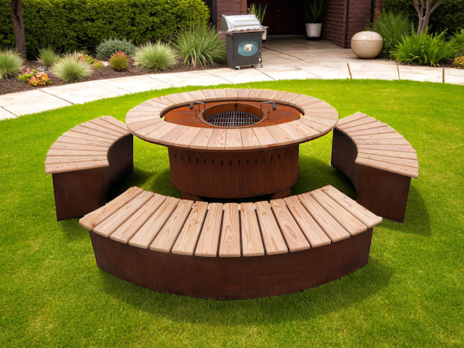 In der Mitte befindet sich ein Grill mit V4A-Edelstahl-Rost, auf dem Speisen direkt am Tisch zubereitet werden können. Die umlaufende Holzverkleidung dient als praktische Ablagefläche. Ein echtes Highlight für Gartenpartys, Lagerfeuerabende oder entspannte Familienmomente.