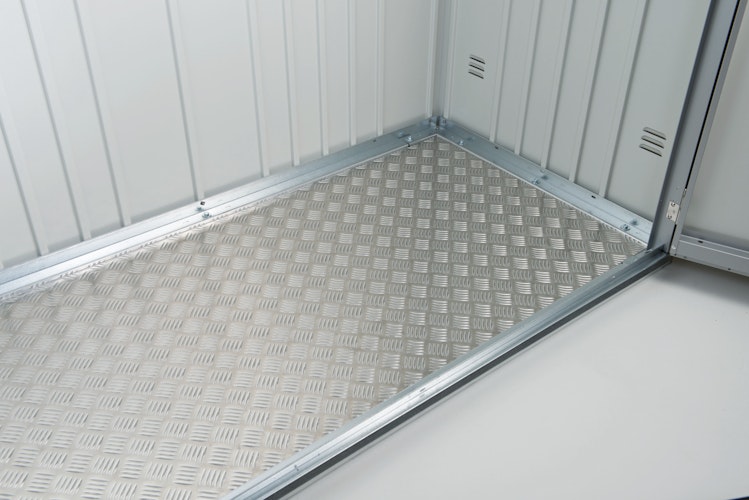 Die hochwertige Alu-Bodenplatte für das Biohort Kaminholzlager Woodstock aus 2 mm Aluminium-Riffelblech schützt gelagertes Holz und Geräte optimal vor Bodenfeuchtigkeit. Kann nachträglich eingebaut werden.