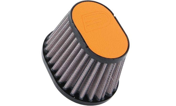 Waschbarer Oval-Sportluftfilter mit auffälligem orangen Kunstlederdeckel. Für Café-Racer & Custombikes, hoher Durchsatz, Award-gewonnen, langlebig & wartungsarm.
