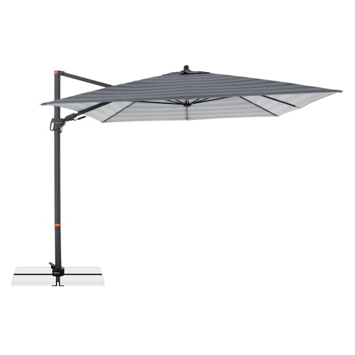 Moderner, quadratischer Kurbel-Ampelschirm, 280 x 280 cm. Beidseitig axial schwenkbar, um 360 Grad drehbar und mit Schrägstellung / Neigungsfunktion. Pulverbeschichteter Alumast. Wetterfester Bezug aus Polyester mit guter Lichtechtheit 5+ und ausgezeichnetem UV-Schutz UV 60 + (Standard 801), abnehmbar und waschbar.