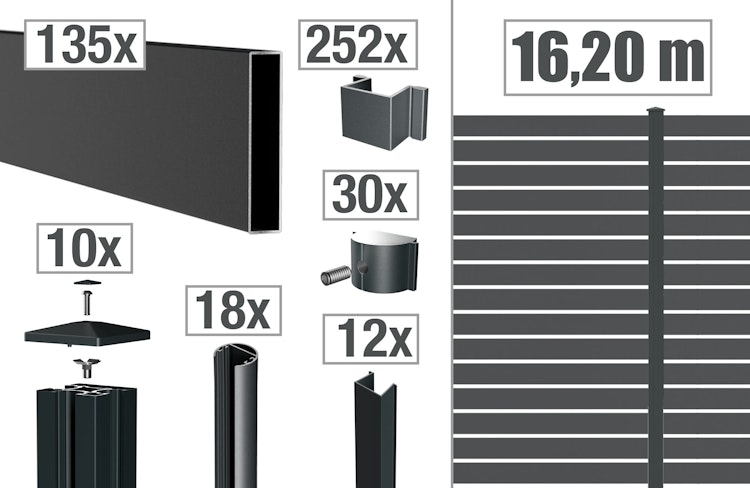 Das Set beinhaltet Einzelprofile, Distanzstücke, Pfosten, Profiladapter und Abdeckleisten.