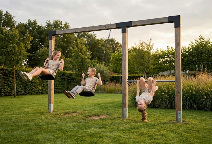 Die EXIT Linea Robust 110 Doppelschaukel mit Reckstange verbindet Schaukeln und Turnen in einem stabilen Spielgerät für den Garten, an dem bis zu drei Kinder gleichzeitig aktiv sein können. Das robuste Holzgestell aus hochwertigem Douglasienholz, die extra breite Reckstange und die grauen Schaukelsitze sorgen für langanhaltenden Spielspaß, hohe Stabilität und eine moderne Optik.