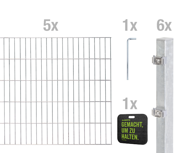 Mit unserem einfach zu montierenden Alberts® Doppelstabmatten 6/5/6 Komplett-Set zum Einbetonieren. Das Set ist von 2 bis 50 Meter Länge verfügbar und beinhaltet alle zur Montage benötigten Komponenten. Beim 10 m-Set erhalten Sie als Gratis Add-on ein Garten-Kniekissen.