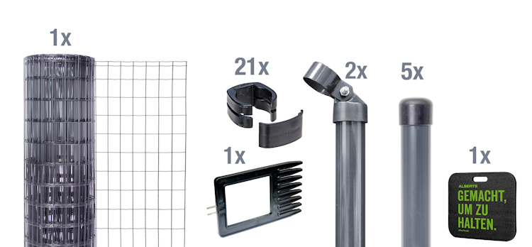 Bei diesem Alberts® Komplettset sind alle Komponenten inklusive, die Sie für 10 bzw. 25 gerade Laufmeter Gitterzaun zum Einbetonieren benötigen