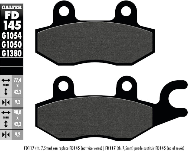 Hochwertiger GALFER Bremsbelag FD145 aus organischem Material G1054. Dieser Satz bietet dank ECE-R-90-Übererfüllung und Rennsport-Technologie maximale Sicherheit.