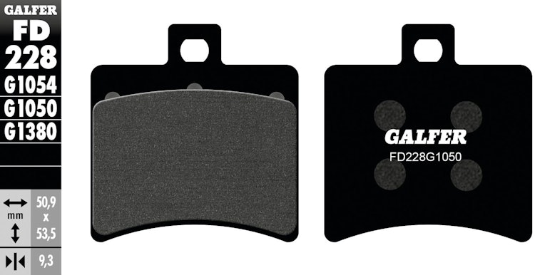 Zertifizierter GALFER Bremsbelag FD228 im Satz. Organisches Scooter-Material G1050 auf Stahl für geprüfte Sicherheit durch ECE-R-90 Übererfüllung.