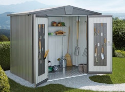 Ein Vorteil von Metallgerätehäusern ist, dass sie in der Regel einfach zu montieren sind, eine lange Lebensdauer haben und kein gegossenes Fundament benötigen. Metallgerätehäuser gibt es sowohl mit Schwenk- als auch mit Schiebetüren. Schiebetüren sind besonders praktisch und platzsparend. Informationen zur Wahl des richtigen Fundaments für ein Gerätehaus finden Sie hier.
