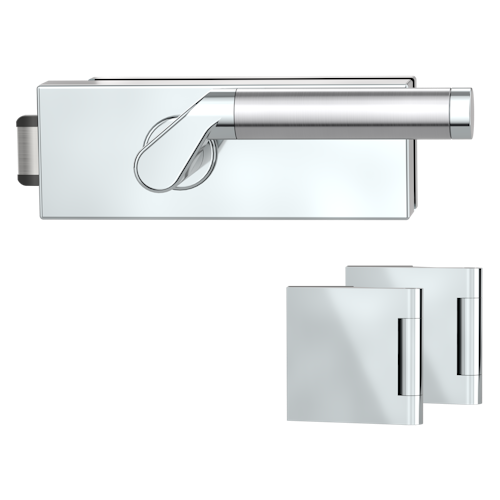 Griffwerk Glastürbeschlag PURISTO S mit Griff CORINNA PROF unverschließbar Flüster 3-tlg. Bänder CORINNA Edelstahl poliert