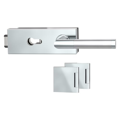 Griffwerk Glastürbeschlag PURISTO S mit Griff LOREDANA Profilzylinder Flüster 3-tlg. Bänder LOREDANA Edelstahl poliert-matt