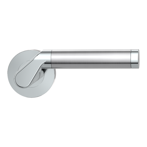 Ansonsten kommt das zylindrische Design dem des Modells LOREDANA sehr ähnlich, besonders auffällig ist bei CORINNA jedoch die Materialkombination aus hochglänzendem Chrom und gebürstetem Edelstahl, während sich die Produktentwickler sonst sehr häufig für spiegelpoliertes und mattes Edelstahl entscheiden. Diese raffinierte Griff-Variante ist auch als Fenstergriff sowie auf einem Schlosskasten ein Highlight, weil sie bewusst nicht die optische Mitte bedient. In dieser Schraubrosettengarnitur der Klasse 4 steckt ebenfalls geballtes technisches Know-how, hochwertige Verarbeitung sowie eine erstklassige Oberflächenbeschaffenheit. Beispielsweise sind auf beiden Seiten des Griffes Federn angebracht, welche das Griffstück in seiner ursprünglichen Position halten, man verwendet wartungsfreie Kunststoff Gleitlager sowie eine fast unverwüstliche Unterkonstruktion aus Metall, auch die Führungsnocken für die M4 Schrauben, welche für die von außen nicht sichtbare Befestigung des Elements sorgen, sind aus Metall.
