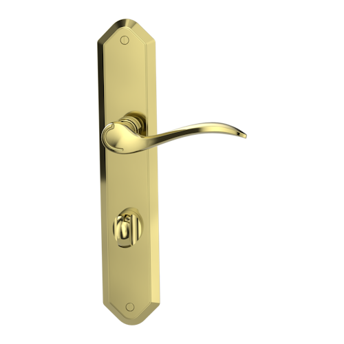Diesen Türgriff gibt es nur in einer Messing Optik und auch nur mit traditionellem Langschild in den Ausführungen BB, PZ oder WC und ebenfalls nur für den privaten Bereich, wohl aber in Kombination mit einem Knopf und einer Ausführung für das stilvolle „Stille Örtchen“. Bei diesem Entwurf ist nicht nur die Handhabe einer wellenförmigen Bewegung nachempfunden, was das Zugreifen sehr angenehm macht; auch das Schild weist oben und unten einen kuppelförmigen Höhepunkt sowie eine, durch eine Naht deutlich ausgeprägte Kante auf, es wird sichtbar auf der Tür verschraubt. Bitte beachten Sie ebenfalls die feine Linienführung der U-förmigen Vertiefung, wo üblicherweise der Daumen zu liegen kommt. Auch in AMADEUS steckt natürlich Jahre lange Erfahrung und technisches Produktwissen vom Feinsten, man hat den Hochhaltemechanismus für den Drücker ebenso integriert wie leistungsfähige und langlebige Gleitlager.