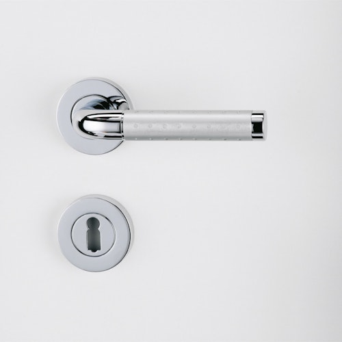 MARINA hat im umfangreichen Sortiment unseres schwäbischen Beschlagspezialisten zahlreiche Verwandte, allen voran SIMONA, die jedoch nicht mit der gepunkteten Handhabe aufwarten kann, ebenso das Erfolgsmodell LARONDA, welches sich jedoch durch einen quadratischen Griffhals auszeichnet. Hierbei handelt es sich allesamt um Modelle mit Schraubtechnik der Benutzungsklasse 4, während die Basismodelle ADINA oder LOREDANA mit Klipptechnik ausgestattet sind und der Klasse 3 zugerechnet werden. MARINA ist eine Kombination aus spiegelpoliertem Chrom und silbrig mattem, fast weißem Aluminium mit kleinen, regelmäßig angeordneten punktförmigen Vertiefungen. Selbstverständlich kann sich auch hier der Kunde, sowohl in den eigenen vier Wänden, als auch beim Einsatz in einem Gewerbeobjekt, auf sämtliche essentielle Produktmerkmale eines Türgriffs für höchste Anforderungen zu 100% verlassen; als da wären: Verdrehfestigkeit dank des Griffwerk Spezialstiftes, lediglich minimale Wackelfreiheit, spielfreie Lagerung auf der Rosette, beste Widerstandswerte bei Zugbeanspruchung und eine beeindruckende Dauerhaftigkeit unter verschärften Prüfbedingungen.