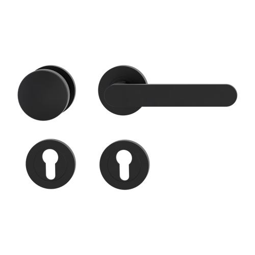 1x Türdrücker, 1x Knopf auf Rosetten, 2x Schlüsselrosetten (PZ), 1x Montagezubehör