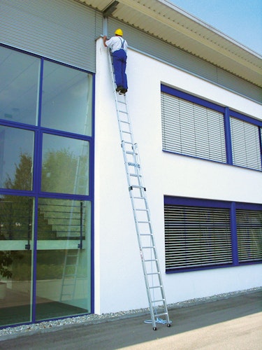 Die Beschläge sind mit Gleitführungen und die Oberleiter mit Wandlaufrollen und mit rutschsicheren nivello-Leiterschuhen ausgestattet.