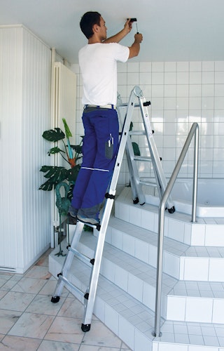 Die Leiter kann als Steh- oder Anlegeleiter eingesetzt werden, treppengängig