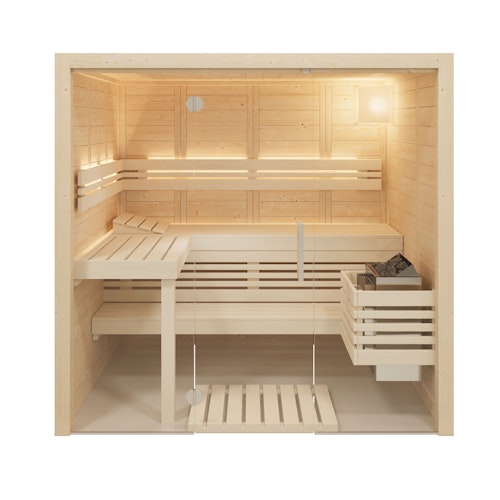 - Massivholzsauna aus 40 mm nordische Fichte in flächenbündiger Kassettenbauweise