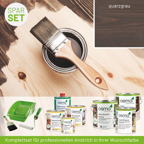 Innen- und Außenanstrich Komplettset für Gartenhäuser bis 5 m² Grundfläche (Lasur-Holzmaserung sichtbar). Dieses Osmo Anstrich-Komplettset enthält alles, was Sie für einen professionellen Anstrich Ihres Gartenhauses (außen Holzschutz Öl-Lasur in Wunschfarbe, innen farblos) benötigen: Holzschutz-Grundierung, 2-facher Lasur-Endanstrich in Wunschfarbe, Fußboden Hartwachs-Öl, Klarwachs für Innenwände und Fenster/Türen, Farbwanne inkl. Abstreifrillen, Einwegeinsätze (3 Stück), Mikrofaserrolle (100 mm breit), Steckbügel, Flächenstreicher (60 mm breit) und 1 Liter Pinselreiniger. Ersparnis ggü. Einzelkauf: ca. 10%.