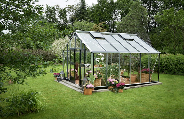 Das sehr geräumige Juliana Gewächshaus "Gärtner"ist geeignet für Gartenfreunde mit großem Platzbedarf zum Anpflanzen und Züchten. Türen, Fenster und Beschläge kommen standardmäßig in schwarz, die Konstruktion kann in aluminiumfarben oder schwarz bestellt werden.