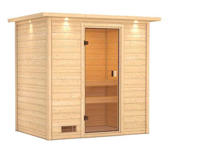 Die Karibu Massivholzsauna Selena aus 38 mm starken Massivholzbrettern (Fronteinstieg) aus hochwertiger nordischer Fichte wird im einfachen Steck-/Schraubsystem errichtet. Die Sauna zeichnet sich durch eine niedrige Höhe (187 cm ohne Dachkranz, 191 cm mit Dachkranz) aus, ideal für niedrige Deckenhöhen. Sie haben die Wahl aus 6 Öfen, ein Dachkranz inkl. LED-Strahler ist optional erhältlich.