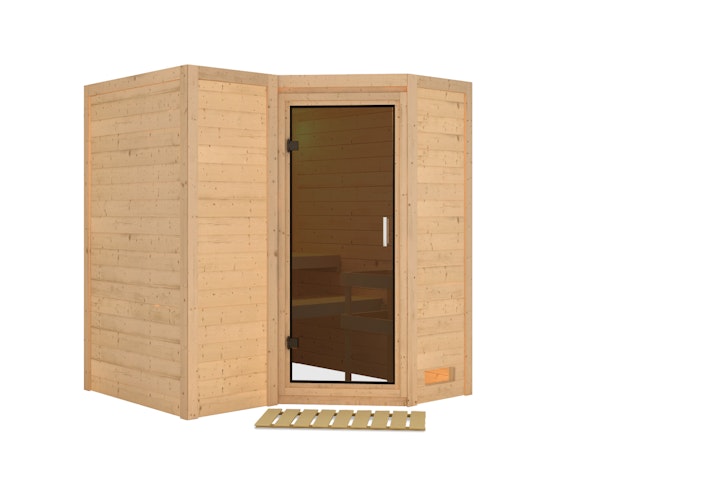 Genießen Sie die besonderen Eigenschaften der Karibu 38 mm Massivholzsauna Sahib 1 mit Fronteinstieg: