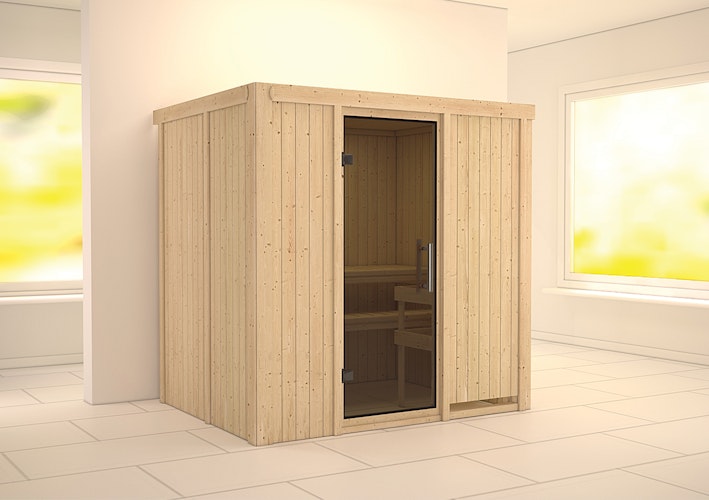 Karibu Sauna Bodin mit Fronteinstieg inkl. Saunatür, Ofenschutzgitter, Kopfstütze und Espenholzbänken. Lieferung je nach Wunsch ohne Ofen oder mit einem 9 kW Ofen mit integrierter Steuerung, einem 9 kW Ofen mit externer Steuerung oder einem 9 kW Bio-Kombiofen mit externer Steuerung.