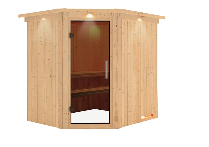 Karibu Sauna Lilja - 68 mm Systemsauna - 230 Volt Plug & Play - Eckeinstieg inkl. Saunatür, Ofenschutzgitter, Kopfstütze und 2 Espenholzbänken. Lieferung je nach Wunsch ohne Ofen oder mit einem 3,6 kW Ofen mit interner Steuerung, 3,6 kW Ofen oder 3,6 kW Bio-Kombiofen jeweils mit externer Steuerung.