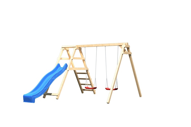 Karibu Akubi Kinderspielgerät Doppelschaukel Felix mit Klettergerüst und Rutsche. Konstruktion: 6,8 x 6,8 cm Pfosten und 9 x 9 cm Schaukelbalken aus naturbelassenem Massivholz. Inkl. 2 Schaukelsitzen in rot, einem Klettergerüst, sowie einer Wellenrutsche in Wunschfarbe.