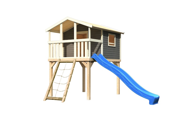 Karibu Kinderspielhaus Benjamin - inkl. stabilen 9 x 9 cm Pfosten, Holzleiter, Sandkasten, Massivholzdach und 2 Fensteröffnungen. Mit dem Spielhaus schaffen Sie ein Spieleparadies für Ihre Liebsten. Optional in terragrauer Behandlung erhältlich. Bei diesem Set ist eine Wellenrutsche in Wunschfarbe, sowie eine Netzrampe inklusive.