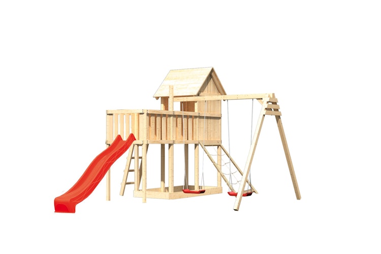 Karibu Akubi Stelzenhaus Frieda mit Wellenrutsche, Doppelschaukelanbau, Anbauplattform und Netzrampe