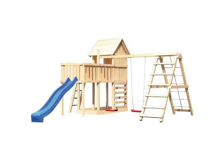 Karibu Akubi Stelzenhaus Frieda mit Wellenrutsche, Doppelschaukelanbau, Klettergerüst, Anbauplattform und Kletterwand