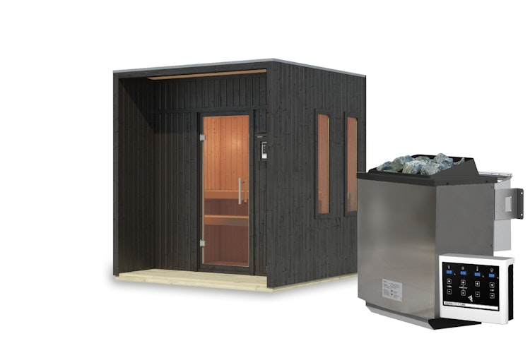Das Karibu Saunahaus Arcadia kombiniert modernes Design mit funktionaler Ausstattung – inklusive Flachdach mit Mineralwolldämmung und stilvoller Farbgebung in Natur und Schwarz. Zwei bequeme Espenholzliegen, große Klarglasfenster und ein Fronteinstieg sorgen für ein lichtdurchflutetes, komfortables Saunaerlebnis. Mit integrierter Terrasse, Massivholzfußboden und Ofenschutz bietet sie durchdachten Luxus für den Außenbereich.