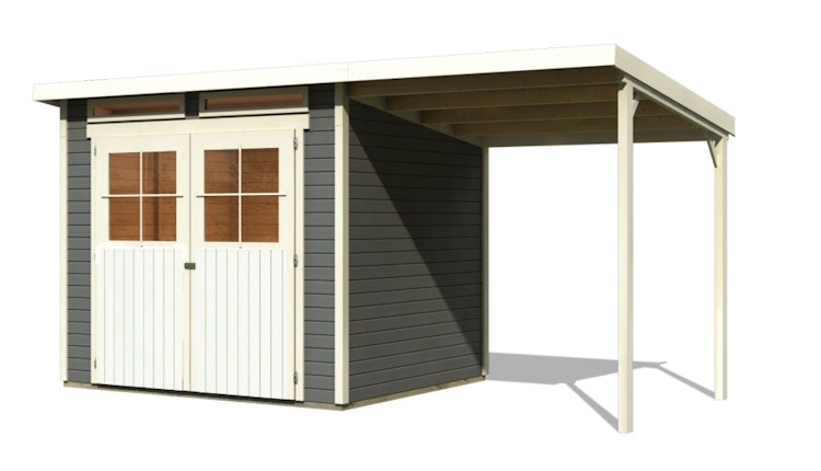 Karibu Gartenhaus Grebenau/Glücksburg - das moderne Flachdach und die breiten Oberlichter machen dieses Gartenhaus zum echten Highlight in Ihrem Garten. Durch die breite Doppelflügeltür lassen sich auch große Gartengeräte problemlos verstauen. Bei diesem Set ist ein ca. 190 cm breites Schleppdach inklusive.