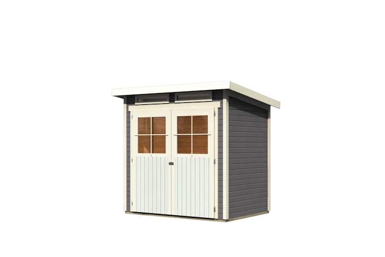 Karibu Gartenhaus Grebenau/Glücksburg - durch das moderne Flachdach und die breiten Oberlichter wird dieses Gartenhaus zum echten Highlight in Ihrem Garten. Durch die breite Doppelflügeltür lassen sich auch große Gartengeräte problemlos verstauen.
