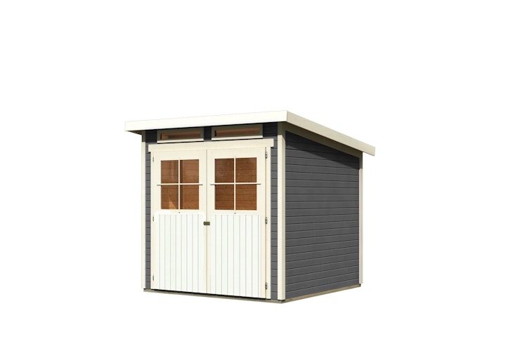 Karibu Gartenhaus Grebenau/Glücksburg - durch das moderne Flachdach und die breiten Oberlichter wird dieses Gartenhaus zum echten Highlight in Ihrem Garten. Durch die breite Doppelflügeltür lassen sich auch große Gartengeräte problemlos verstauen.