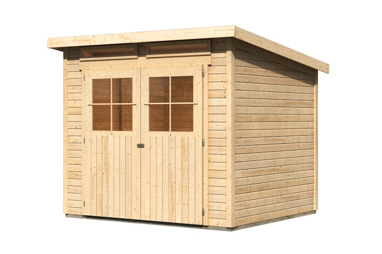 Karibu Gartenhaus Grebenau/Glücksburg - durch das moderne Flachdach und die breiten Oberlichter wird dieses Gartenhaus zum echten Highlight in Ihrem Garten. Durch die breite Doppelflügeltür lassen sich auch große Gartengeräte problemlos verstauen.