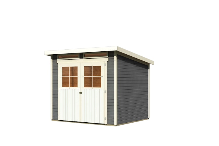 Karibu Gartenhaus Grebenau/Glücksburg - durch das moderne Flachdach und die breiten Oberlichter wird dieses Gartenhaus zum echten Highlight in Ihrem Garten. Durch die breite Doppelflügeltür lassen sich auch große Gartengeräte problemlos verstauen.
