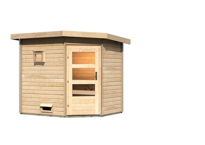 Karibu Gartensauna Pultdach Saunahaus Mikka mit Eckeinstieg naturbelassen inkl. gratis Sauna-Zubehörset im Wert von 234,94 €