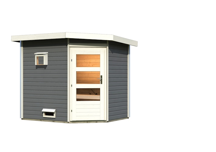 Karibu Gartensauna Pultdach Saunahaus Mikka mit Eckeinstieg terragrau