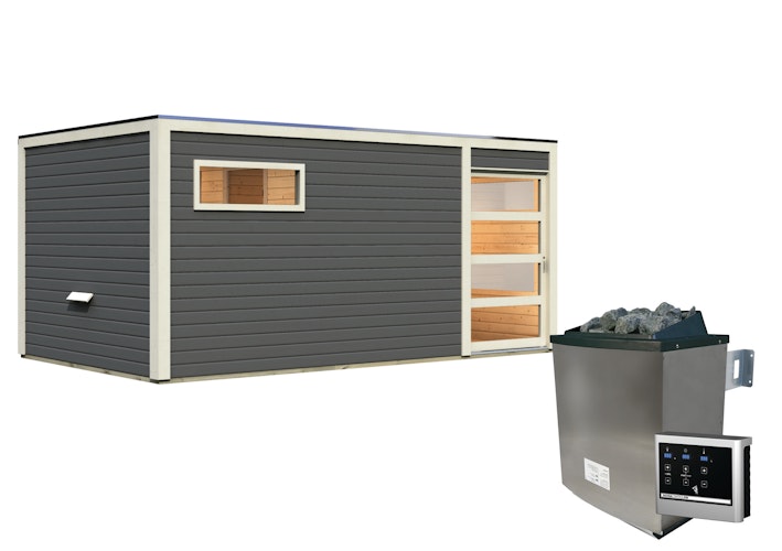 Karibu Gartensauna Saunahaus Hygge inkl. Vorraum, terragrau inkl. gratis 9 kW Bio-Saunaofen im Wert von 879,99 €