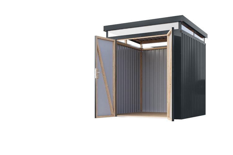 Das Karibu Metall Gartenhaus Aurum mit Flachdach bietet eine robuste und langlebige Aufbewahrungslösung, die sowohl funktional als auch wartungsarm ist, mit einer modernen Elementbauweise aus Trapezblech. Ausgestattet mit einer Doppelflügeltür und integriertem Oberlicht, kombiniert dieses Gartenhaus Schutz vor Witterungseinflüssen mit stilvollem Design.