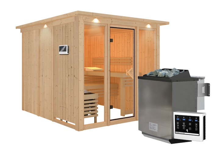 Karibu Sauna Askja Superior mit Fronteinstieg 68 mm inkl. gratis 9 kW Bio-Saunaofen im Wert von 719 €