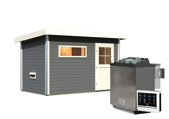 Karibu Gartensauna Pultdach Saunahaus Skrollan 1 mit Vorraum terragrau