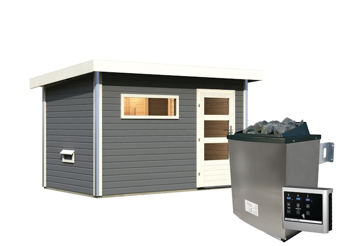 Karibu Gartensauna Pultdach Saunahaus Skrollan 1 mit Vorraum terragrau