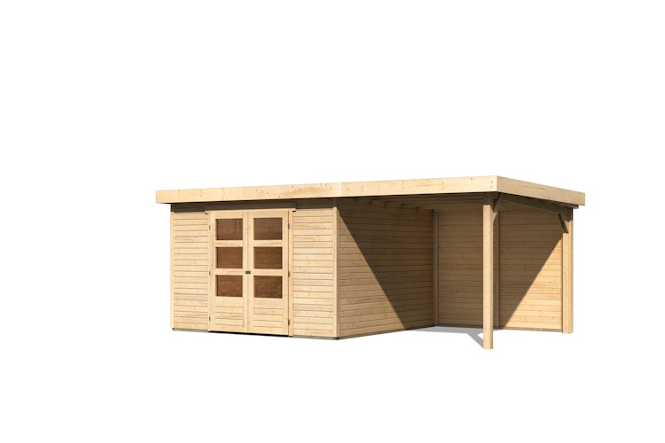 Mit dem Karibu/Woodfeeling Gartenhaus Askola liegen Sie voll im Trend. Das 16 mm Pultdach und die Doppelflügeltür runden das moderne Design perfekt ab. Bei diesem Set ist ein 225 cm breites Schleppdach mit Rückwand (240 cm Dachstand) inklusive, das an beiden Seiten des Hauses montiert werden kann.
