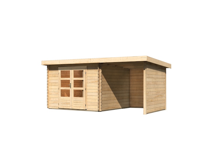 Das flexibel einsetzbare Karibu/Woodfeeling Gartenhaus Bastrup wird durch den optionalen Dachausbau zu einem Highlight in Ihrem Garten! Das Gartenhaus kommt mit 28 mm Blockbohlen und einem 16 mm Pultdach. Der Anbau kann beidseitig platziert werden. Zusätzlich kann eine Seiten- und Rückwand für perfekten Sichtschutz bestellt werden.
