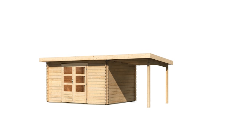 Das flexibel einsetzbare Karibu/Woodfeeling Gartenhaus Bastrup 7 wird durch den optionalen Dachausbau zu einem Highlight in Ihrem Garten! Das Gartenhaus kommt mit 28 mm Blockbohlen und einem 16 mm Massivholz-Pultdach. Der Anbau kann beidseitig platziert werden. Zusätzlich kann eine Seiten- und Rückwand für perfekten Sichtschutz bestellt werden.