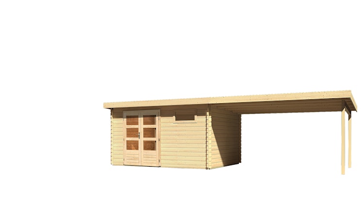 Das flexibel einsetzbare Karibu/Woodfeeling Gartenhaus Bastrup 8 wird durch den optionalen Dachausbau zu einem Highlight in Ihrem Garten! Das Gartenhaus kommt mit 28 mm Blockbohlen und einem 16 mm Massivholz-Pultdach. Der Anbau kann beidseitig platziert werden. Zusätzlich kann eine Seiten- und Rückwand für perfekten Sichtschutz bestellt werden.